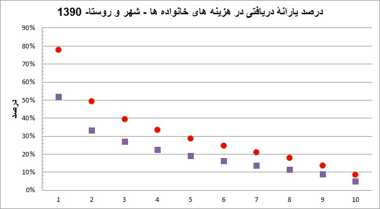 در عین حال این نمودار نشان می دهد که سیستمهای حمایتی موجود نیازمند اصلاح هستند. چیزی در حد 32 درصد ضعیفترین دهک روستایی و 22 درصد ضعیفترین دهک شهری کمک دریافت می کنند. این نسبت باید افزایش یابد. احتمالاً نه به صد درصد، هم به این دلیل که برخی ممکن است این کمکها را ذکر نکنند (و دلایل آماری مشابه) و هم به این دلیل که ممکن است کسی نخواهد از این کمکها استفاده کند. از طرف دیگر افرادی در دهکهای بالا هستند که چنین کمکهایی دریافت می کنند. احتمال دارد برخی از این افراد نیازمند چنین کمکهایی نباشند. مهمتر از این دو، آمار بودجۀ خانوار به تنهایی برای دریافت اطلاعات کافی نیست و باید با سایر اطلاعات تقویت شود.