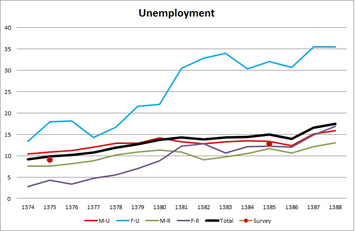 بر مبنای نمودار و تحلیل فوق و نیز بر مبنای داده های پراکنده ولی کمابیش قابل توجهی که از رشد ضعیف اقتصادی سالهای اخیر وجود دارد، شخصاً به هر داده ای که نرخ بیکاری را زیر 15 درصد معرفی می کند مشکوکم. بیشتر از آن به هر مطلبی که خبر از کاهش سریع و قابل توجه نرخ بیکاری بدهد، مشکوکم.