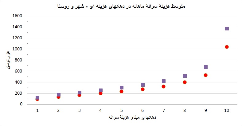 برای داشتن تصویری بر مبنای آمار، متوسط هزینۀ سرانه را بر مبنای دهکهای هزینۀ سرانه در شهرها و روستاها از آمارگیری هزینه و بودجۀ خانوار 1391 درآوردم و ارقام را در 1.35 ضرب کردم تا ارقام تقریبی برای سال 1392 بدست یباید، با این فرض که تورم امسال حدود 35 درصد بوده است. همچنین رقم معادل اجارۀ منزل  مسکونی را که در هزینه ها می آید، بدون اینکه واقعاَ پرداخت شود، از هزینه ها کم کرده ام. در نتیجه رقمی که بدست آمده است، پرداختی واقعی خانوار است. (ارقام موجود در آمارگیری را با ارقامی که دفترچۀ هزینه و بودجه داده است، مطابقت دادم. ارقام خیلی نزدیکند.)