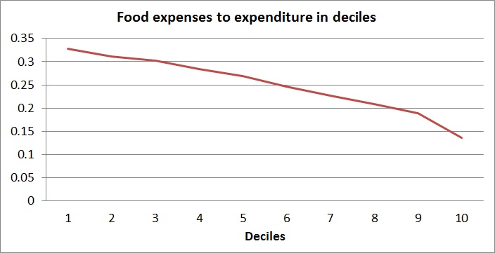 نمودار زیر نسبت هزینه های غذا و مواد غذایی از کل هزینه های خانوار را برای دهکهای هزینه ای نشان می دهد.