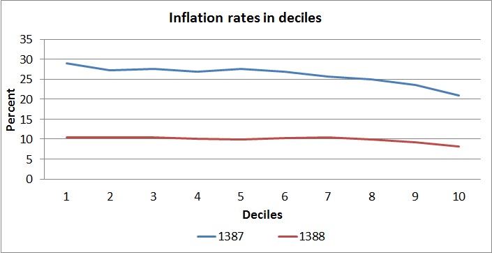 اخیراً مرکز آمار تورم را برای دهکهای هزینه ای منتشر کرده است. نمودار زیر این نرخها را برای سال 1387 و 1388 نشان می دهد. دو نکته به وضوح از این نمودار قابل استخراج است. اول اینکه دهکهای هزینه ای بالا تورم پایینتری را تجربه می کنند و دوم اینکه هر چه تورم بالاتر باشد تفاوت تورم دهکهای هزینه ای بیشتر است. افت تورم با افزایش درآمد در سال 1387 که نرخ متوسط تورم 25.5 درصد بوده به مراتب بیشتر از افت تورم در سال 1388 بود که نرخ تورمی معادل 9.5 درصد داشت.